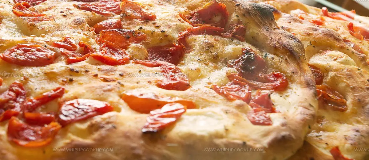 Classic versions feature ripe tomatoes and oregano spread across a simple dough made from flour, yeast, salt, sugar, water, and olive oil.