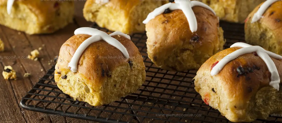 Each bun features a distinctive cross on top, created using shortcrust pastry, flour and water mixture, or icing sugar.