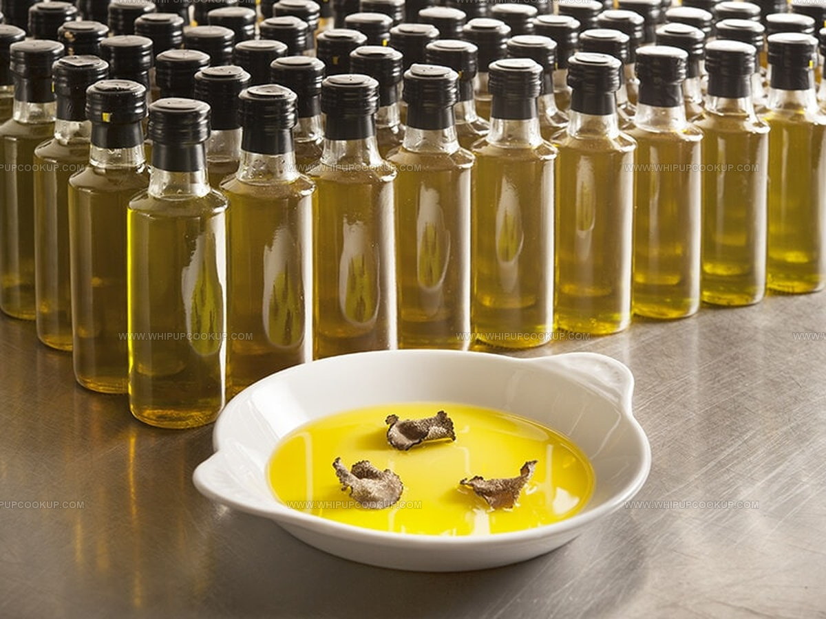 Typically, truffle oil is made by infusing a neutral oil, such as olive or grapeseed oil, with synthetic or natural compounds that mimic the aroma of black or white truffles. It is mainly used as a finishing oil, drizzled over foods like pasta, pizza, risotto, eggs, or salads to elevate their flavor profile.