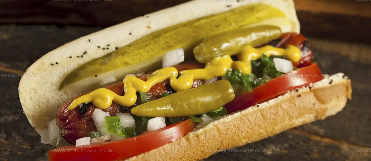Vendors created this unique culinary creation by nestling a Vienna beef hot dog into a steamed poppyseed bun and layering it with green relish, yellow mustard, diced onions, red tomato slices, kosher pickles, pickled peppers, and a sprinkle of celery salt.