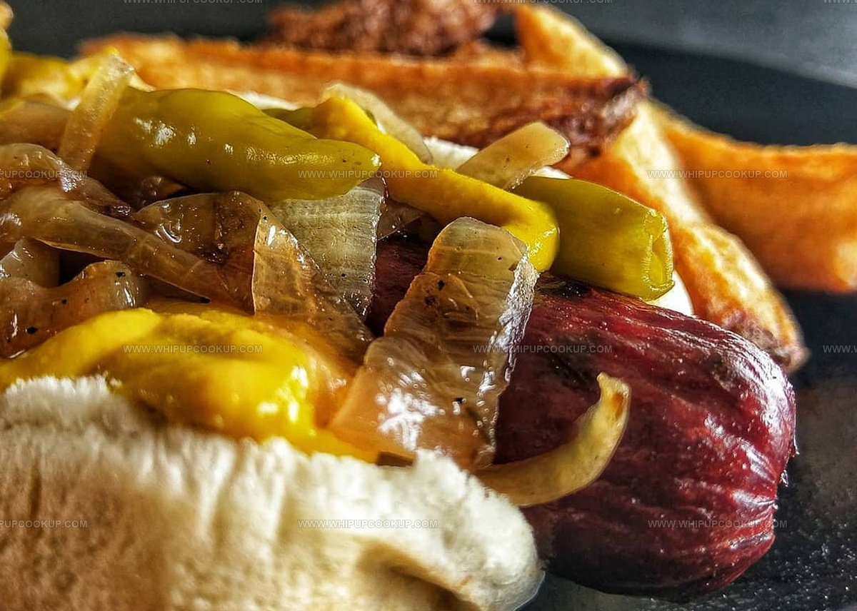 Grilled or fried Polish sausages sit nestled in soft buns topped with caramelized grilled onions and tangy yellow mustard.