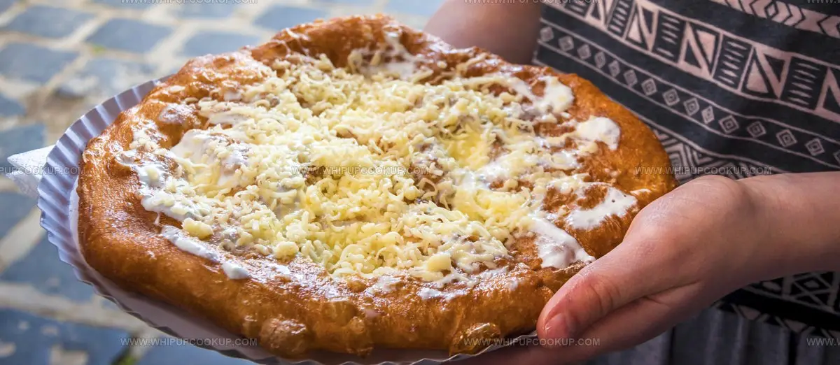 Langos are golden-brown Hungarian street food discs deep-fried to crispy perfection using simple flour-based dough.