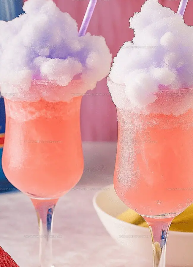 - Delicately place a fluffy pink cotton candy segment along the glass rim, taking care to keep it dry and prevent premature melting. This creates both a decorative and interactive garnish element.