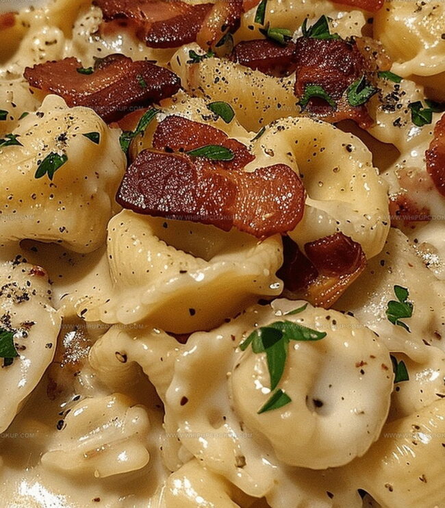 Crispy bacon pieces add a delightful crunch to every twirled forkful.
