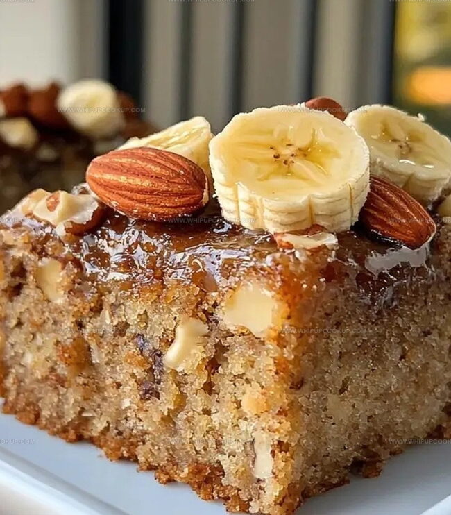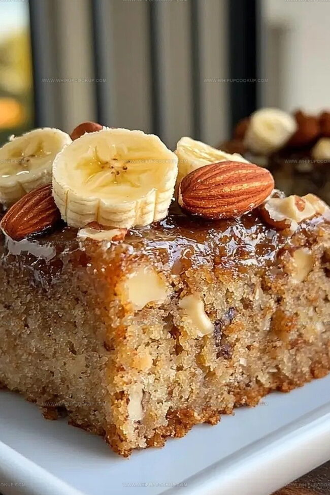 - Drizzle the warm caramel glaze generously over the slightly cooled cake, decorating with delicate banana slices and scattered whole almonds or walnuts.