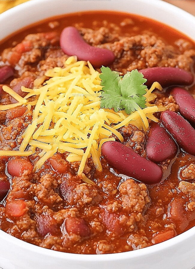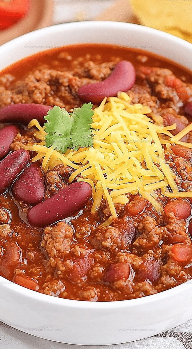 - Transfer the chili into serving bowls. Garnish with shredded cheddar cheese, diced red onions, and optional toppings like sour cream or fresh cilantro for added complexity and visual appeal.