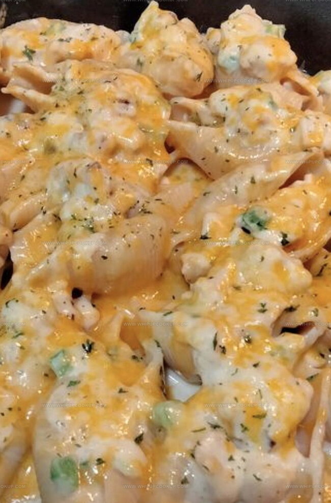 - Generously stuff each shell with the savory chicken mixture, arranging them carefully in the prepared dish with the opening facing upward.
