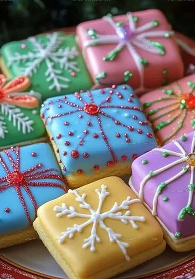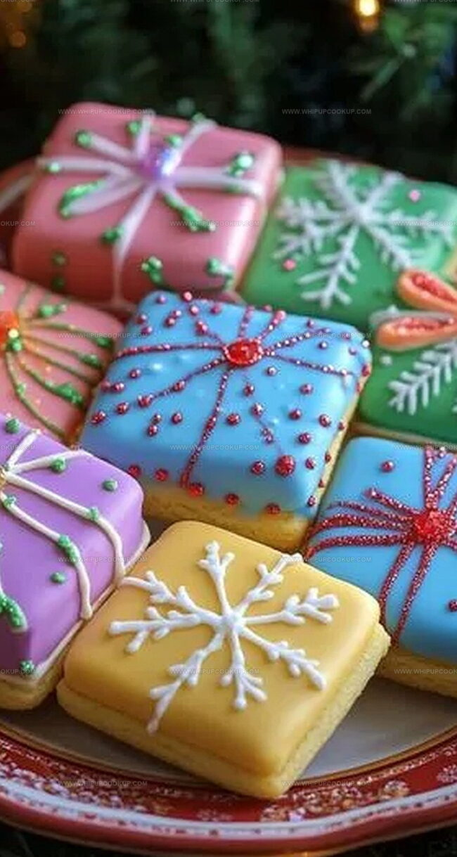 Sprinkles and icing create magical patterns resembling wrapped gifts.