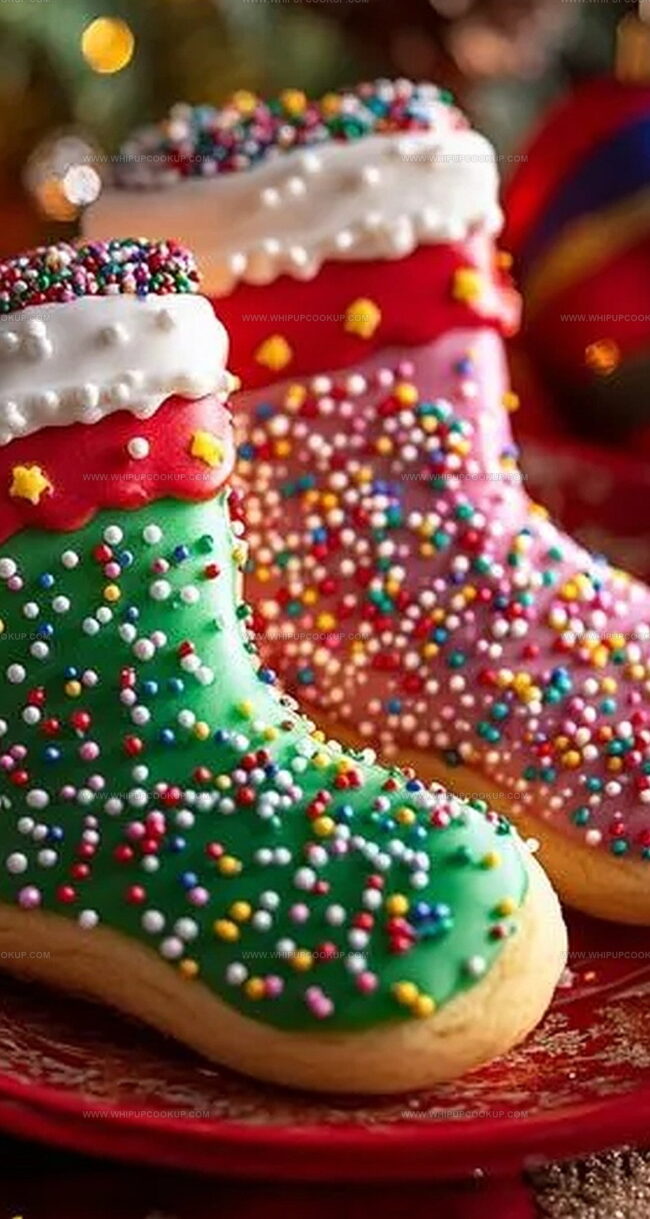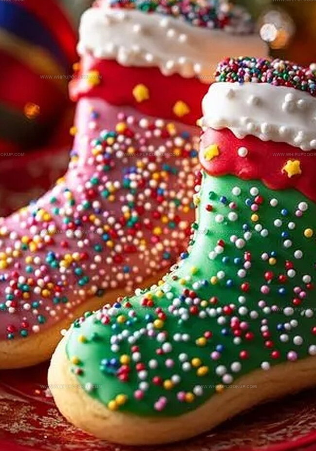 Use piping icing to outline the stocking shape and let it set for a moment. Flood the cookie with thinner icing, using a toothpick to spread it evenly across the surface. Add a fluffy white icing cuff to mimic a cozy stocking trim. While the icing is still wet, sprinkle on some festive decorations. Allow cookies to dry completely before serving or storing.