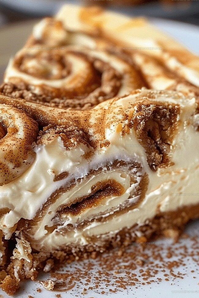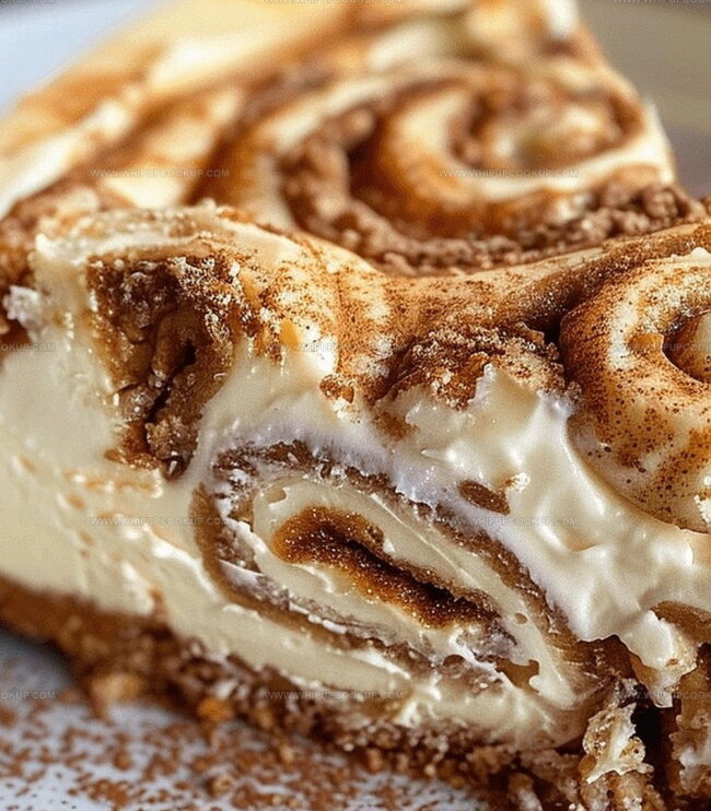 Creamy cheesecake layers intertwine with soft, gooey cinnamon roll essence.