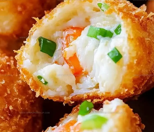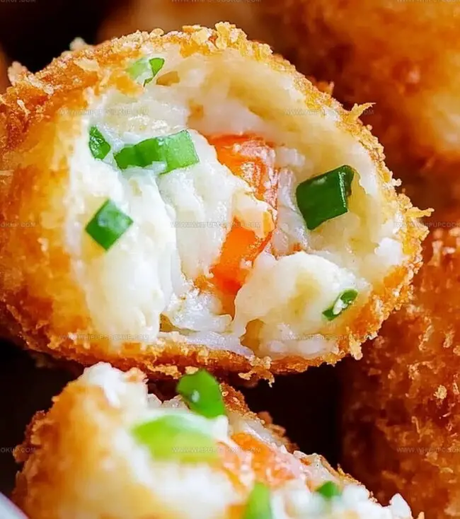 - Establish a three-stage coating process using individual shallow containers: first dust each sphere in flour, creating a light base layer, then immerse in beaten eggs to generate adhesion, and finally enrobe completely in panko breadcrumbs, pressing gently to secure a crisp, even exterior.