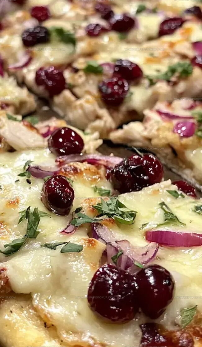 Cut the pizza into wedges and serve immediately. Enjoy the harmonious blend of sweet cranberry, tender chicken, and luxurious melted cheese.