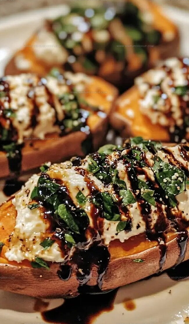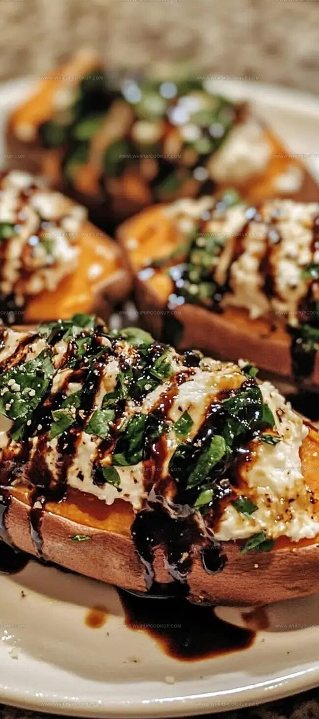 - Remove from oven and generously drizzle the prepared balsamic cranberry glaze over the stuffed sweet potatoes. Serve immediately while warm and enjoy the rich, complex flavors.