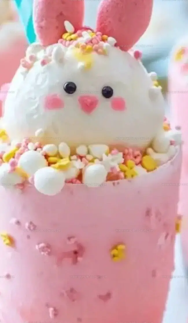 Soft marshmallow bunnies peek from the rim, adding a charming touch to each glass.