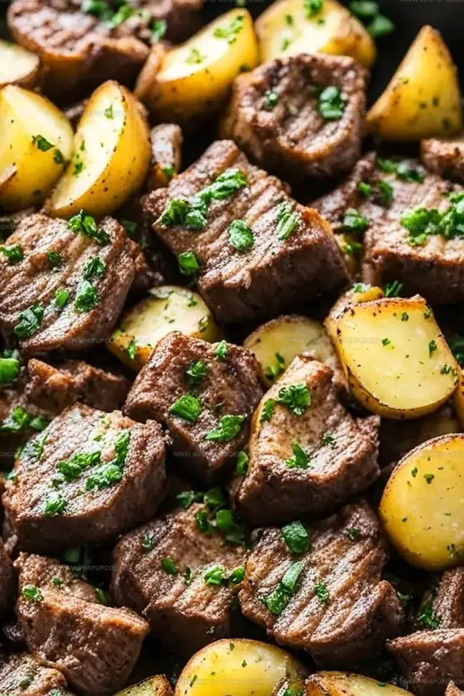 - Gently toss potatoes and steak in the aromatic garlic butter, ensuring complete flavor coverage.