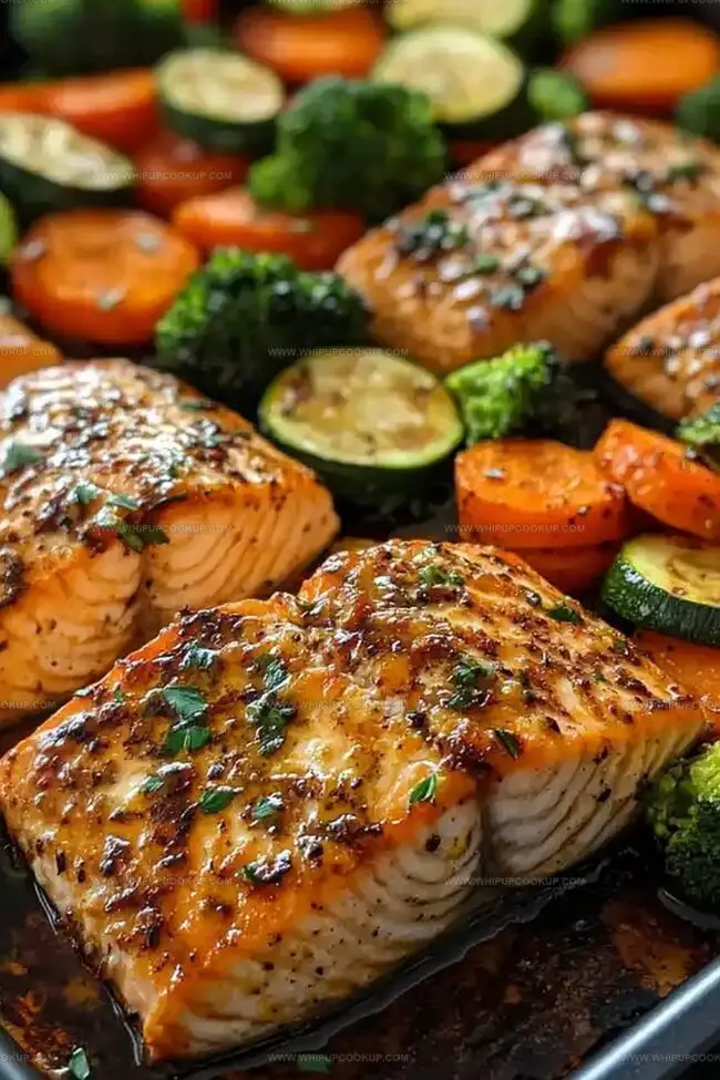 - Extract the pan from the oven, elevate flavors by drizzling fresh lemon juice over the salmon and vegetables, then garnish with delicate herb accents of parsley or dill. Serve immediately for maximum gustatory pleasure.