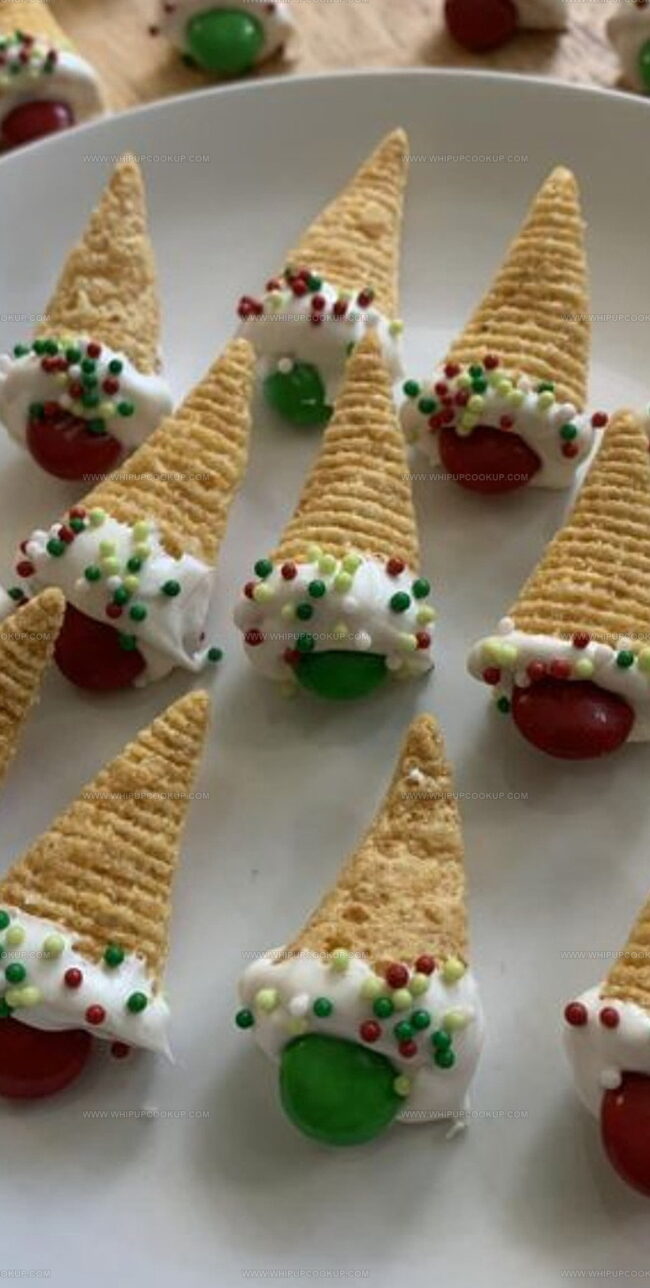 - Immediately press a vibrant red or green chocolate button into the base of the dipped Bugle, creating a playful “hat band” effect.