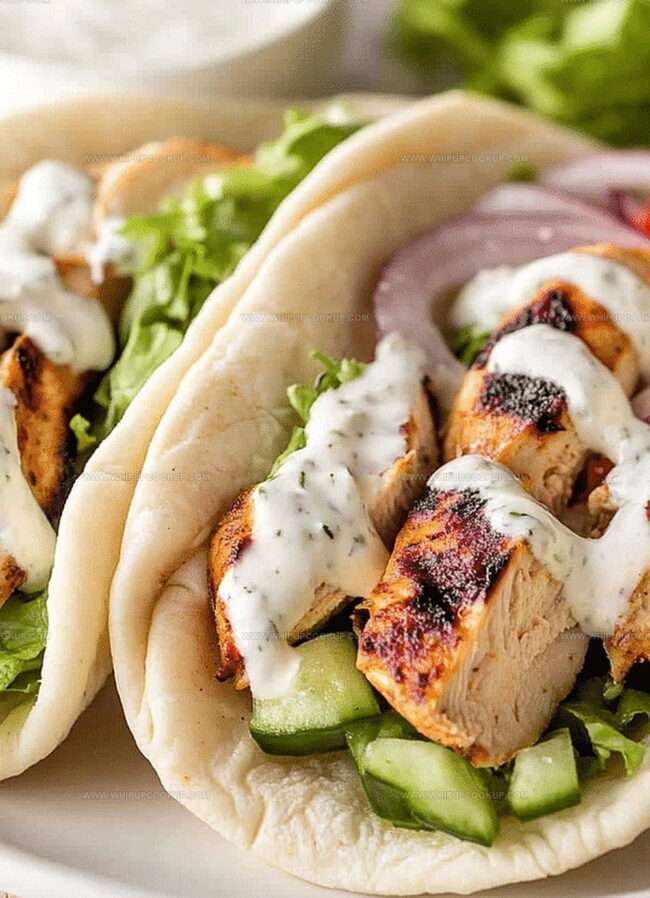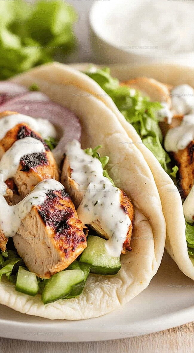 - Slice grilled chicken into thin strips. Layer pitas with chicken, crisp romaine lettuce, halved cherry tomatoes, thinly sliced red onion, and generous tzatziki sauce. Fold pita edges inward, creating compact handheld gyro.