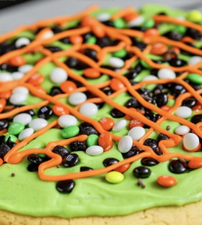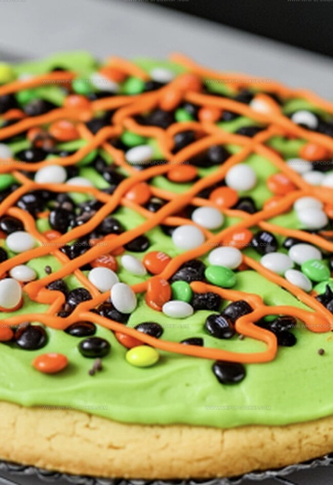 - Embellish the frosted cookie cake with an assortment of Halloween candies and thematic sprinkles, arranging them creatively to capture the spooky spirit.