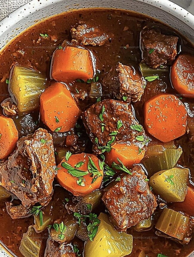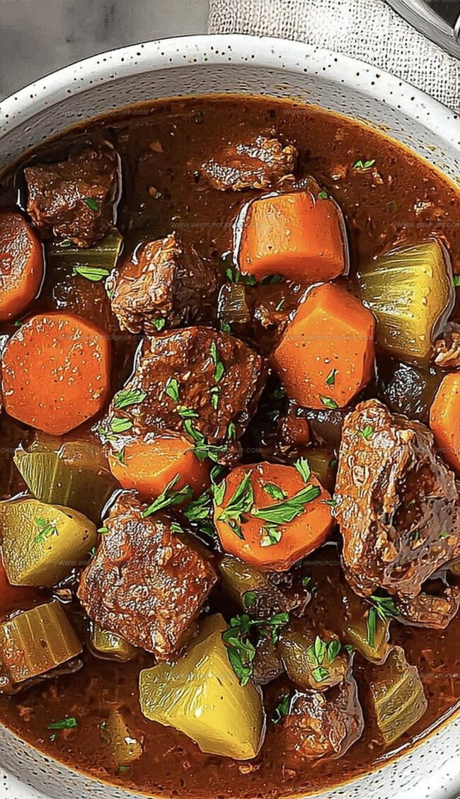 Rich, tender chunks of beef simmer alongside vibrant vegetables in a deeply seasoned broth.