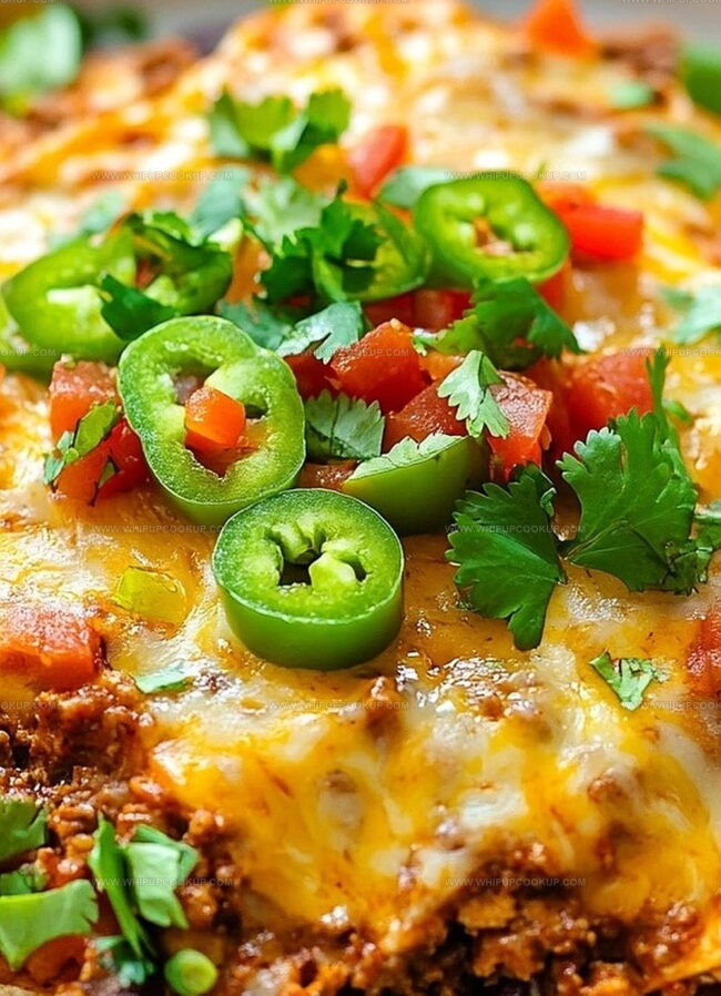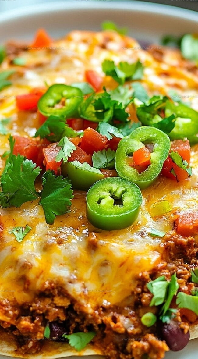 - Layer additional ingredients like refried beans, shredded cheese, and chopped green chilies across the beef mixture.