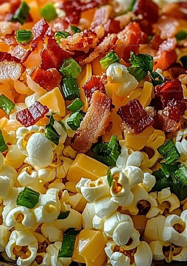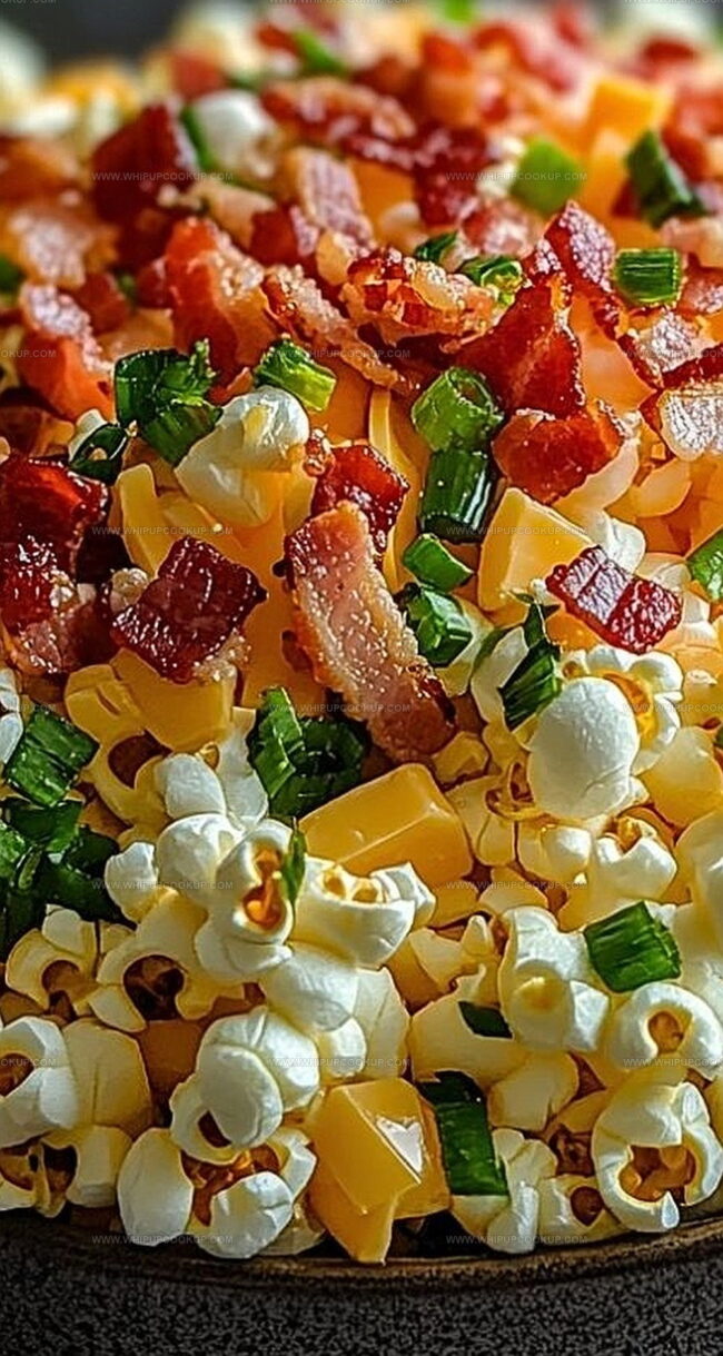 - Transfer popcorn into a spacious mixing vessel. Incorporate crumbled bacon, shredded cheese, prepared vegetables, and chopped parsley. Gently cascade dressing across ingredients, folding delicately to distribute flavors without crushing popcorn.