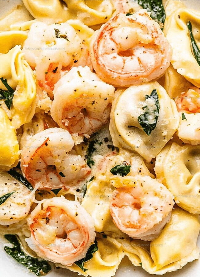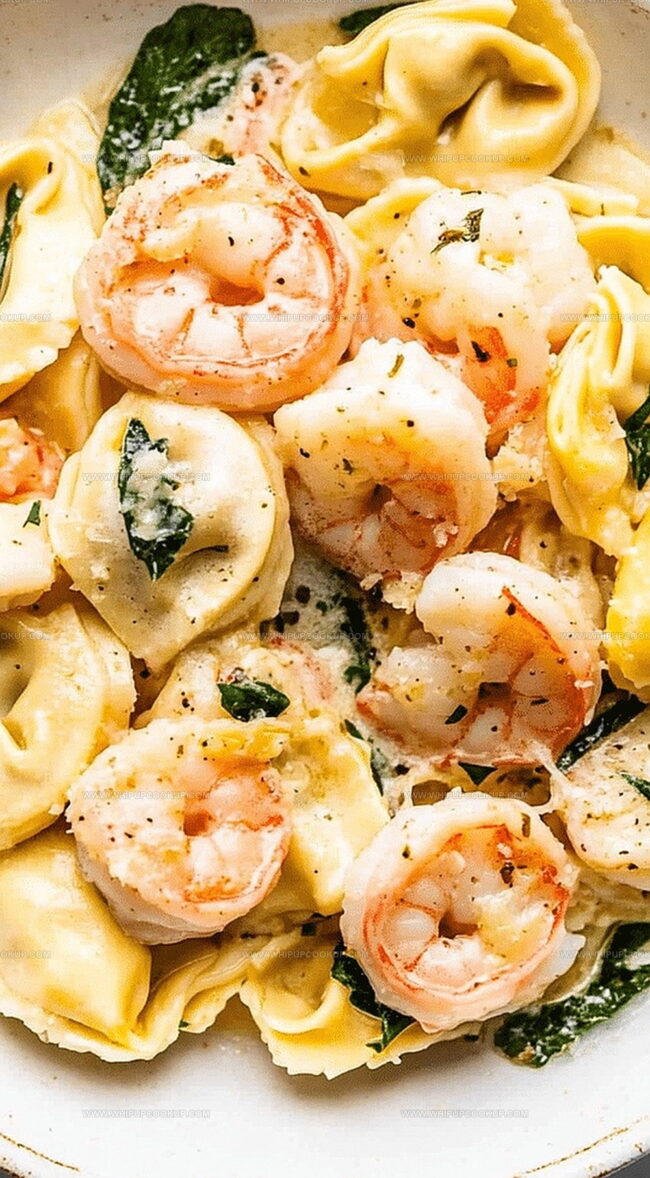 Creamy garlic sauce drapes over plump shrimp tortellini, creating a luxurious dish that whispers comfort and elegance.