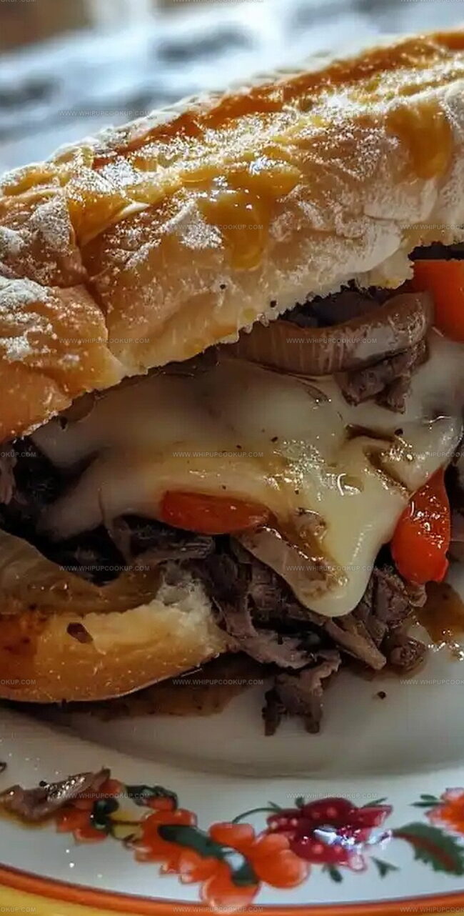 - Pile the slow-cooked beef, peppers, and onions generously onto each roll. Top with provolone cheese slices, covering the entire surface.