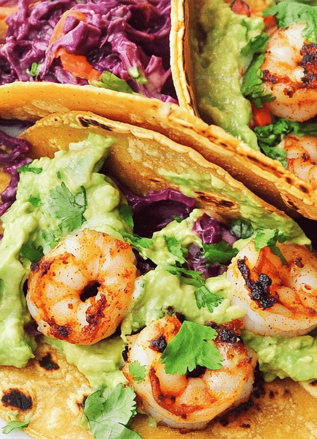 - Assemble tacos by layering cabbage slaw, cooked shrimp, and generously drizzling avocado sauce.