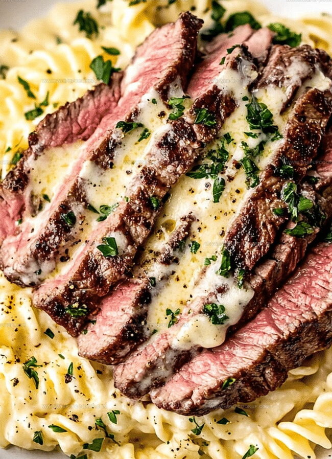 - Slice rested steak into thin, diagonal strips. Plate pasta, arranging steak slices elegantly on top. Garnish with additional Parmesan cheese for enhanced flavor and presentation.