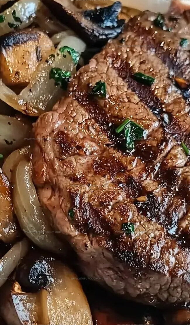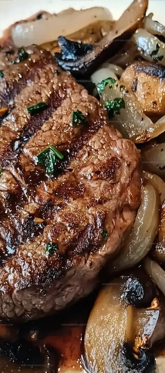 Savory steak paired with caramelized onions and earthy mushrooms creates a mouthwatering culinary experience.