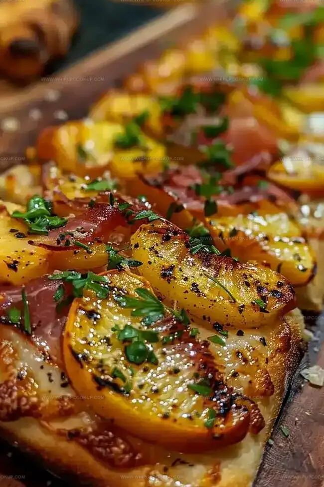 The combination of sweet grilled peaches, salty prosciutto, and melted mozzarella creates a perfect balance of flavors that elevates this flatbread from ordinary to extraordinary.
