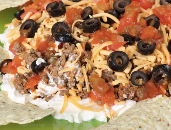 Return the dip to the refrigerator for another hour to allow layers to merge and flavors to meld. When ready, serve alongside tortilla chips for a perfect party appetizer.