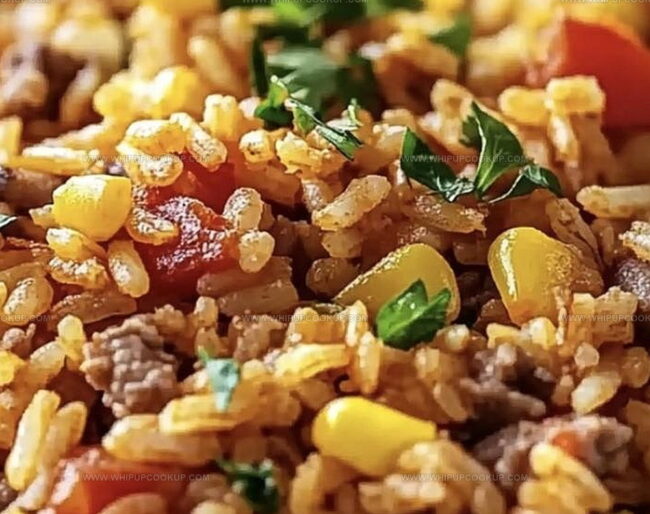 Crispy ground beef mingles with fluffy rice, creating a delightful fusion of textures and tastes.
