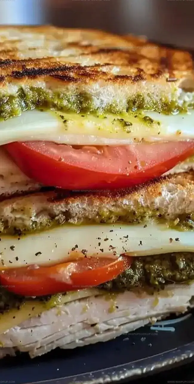 Savor Mediterranean flavors with this irresistible turkey pesto sandwich, where tender slices of roasted turkey mingle with zesty basil pesto. Crisp artisan bread and fresh ingredients create a quick, satisfying meal perfect for lunch or casual dining.