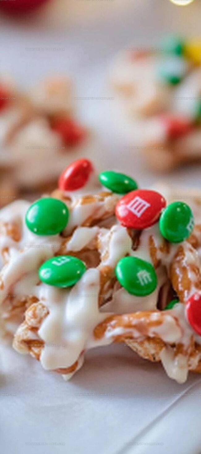 - While the candy remains warm and malleable, enhance each cluster’s visual appeal by adorning them with festive holiday M&Ms and optional sparkling holiday sprinkles. Allow the confections to stabilize and solidify at ambient room temperature, anticipating complete setting within approximately fifteen minutes.