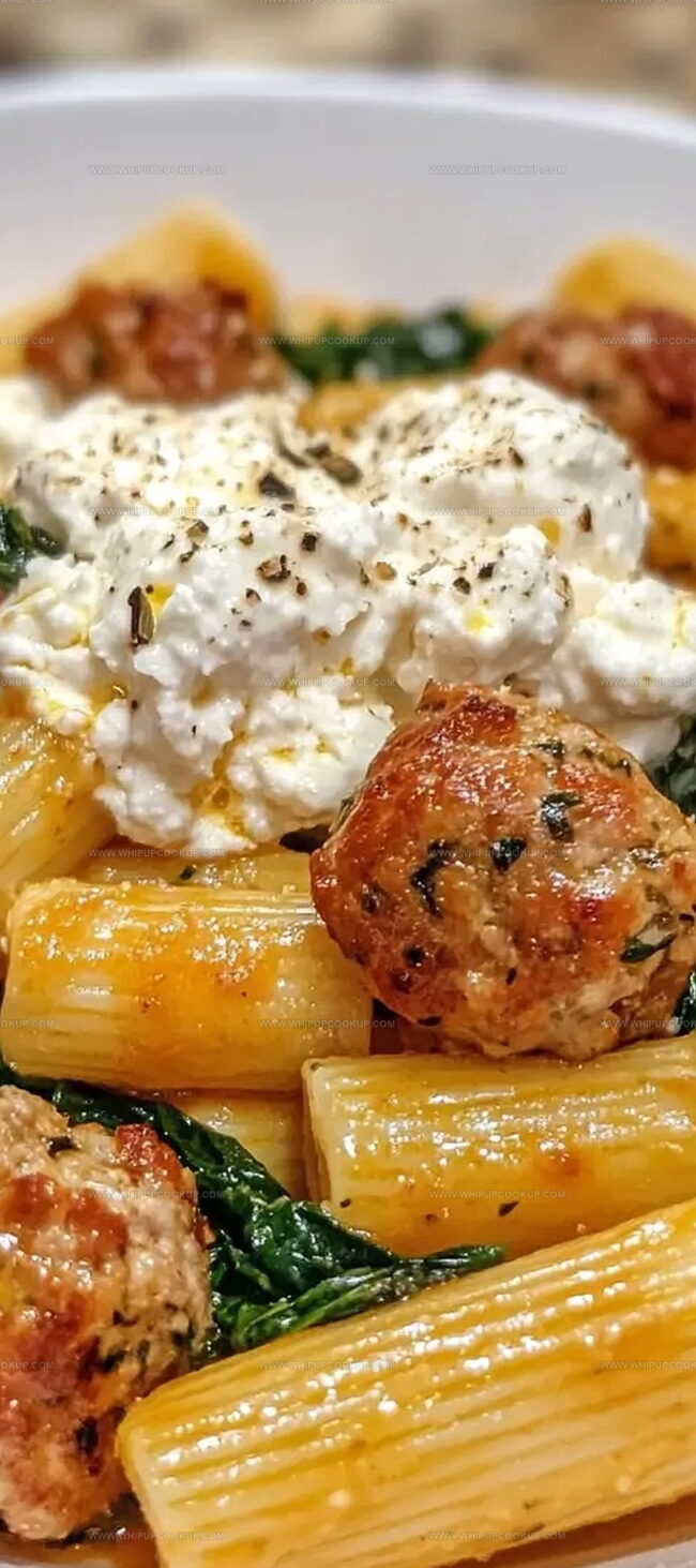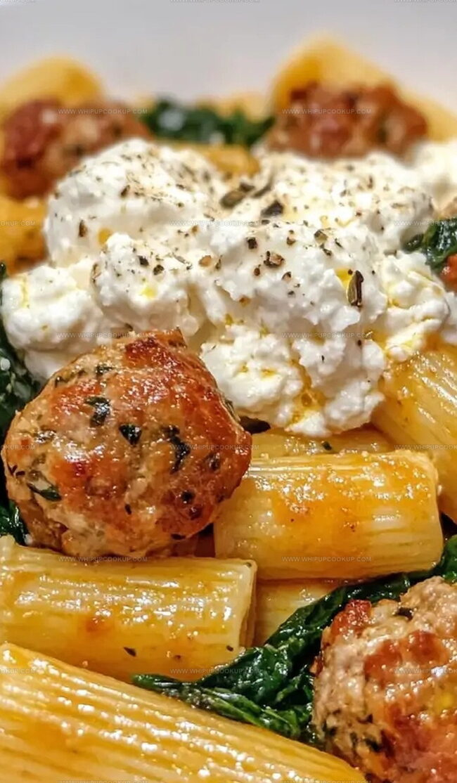 Easy Zesty Turkey & Ricotta Meatballs with Garlic Spinach Rigatoni Recipe